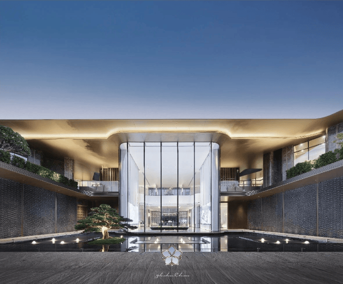 龙鳞水幕景墙,百年迎客松低调隐奢