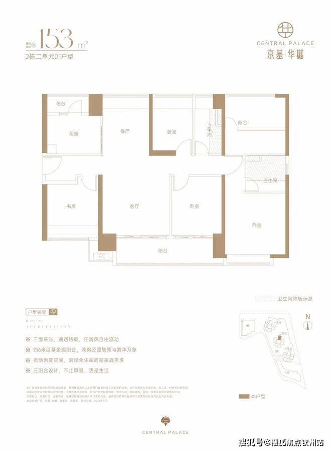 仅2栋2单元05户型才有,设计的是经典竖厅格局,LDKB一体化,动静分区,四开间朝南,U型厨房,卫生间干湿分离,得房率约73%(不含赠送),阳台西南朝向。