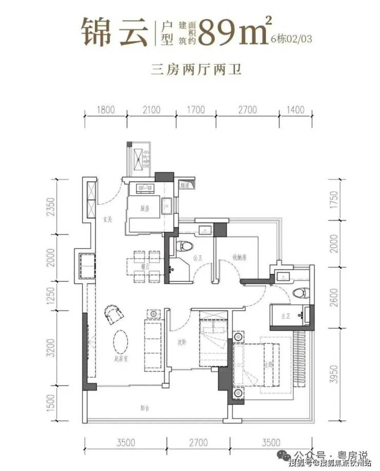 以LDKB无界场域盛放温情,以阳光长廊安放志趣,更以270°环幕主卧,升华为奢适的私密天地。• 锦云·建面约89㎡3房2厅2卫:南向阔厅,景致常驻,间间开阔,尺度舒适