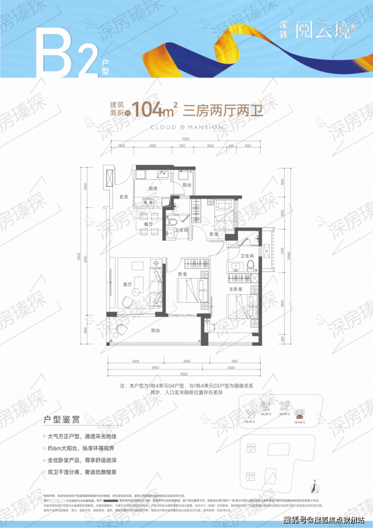 户型:本次推售1栋4单元,共246套房源,面积100-104平方米,均为3房2卫户型。
