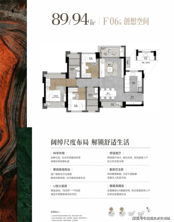 89-94㎡的3房2厅2卫,06户型,设计的是横厅南北通透格局,进门入户玄关,客厅实测3.28米开间,LDB一体化设计,全屋8面飘窗,四开间朝南,主卧南北通套房,3个卧室分别做到了主卧13.65㎡/次卧7.61㎡/次卧7.31㎡(实测面积,不含墙体),U型厨房,卫生间干湿分离,得房率约76-81%(不含赠送),阳台主朝东北向。