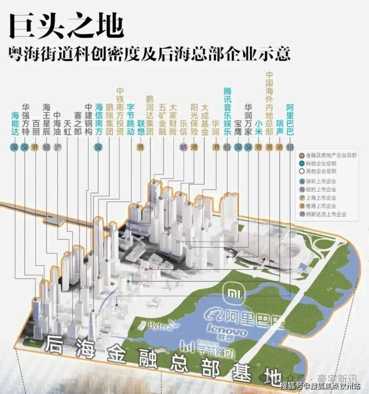 ▲深圳湾后海金融总部基地示意图(图片来源:深圳规划网)。从这里的名企可以看出,阿里、小米、联想、中海油、字节跳动、中铁等企业的区域总部或国际总部悉数汇聚在这里,使得深圳湾成为整个中国企业总部最密集的区域之一。
