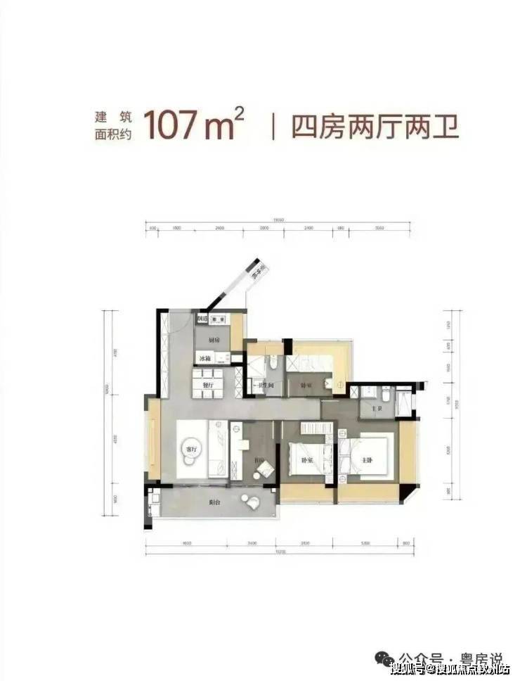 107㎡的4房2厅2卫,设计的是经典竖厅格局,客厅4米开间,LDKB一体化,S墙设计预留冰箱卡槽位,动静分区,分别做到了主卧17.18㎡/次卧11.2㎡/次卧8.64m²/次卧7.68㎡(包含墙体飘窗),U型厨房,卫生间干湿分离,得房率约79.6%(不含赠送),客厅连接次卧出10.24m²观景大阳台,东南朝向。套内面积85.19m²+赠送面积22.96m²=实用面积108.15m²,加上赠送面积后得房率101.08%。
