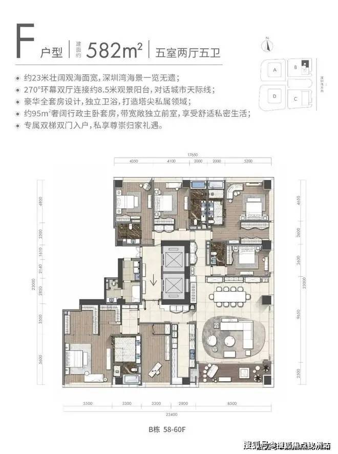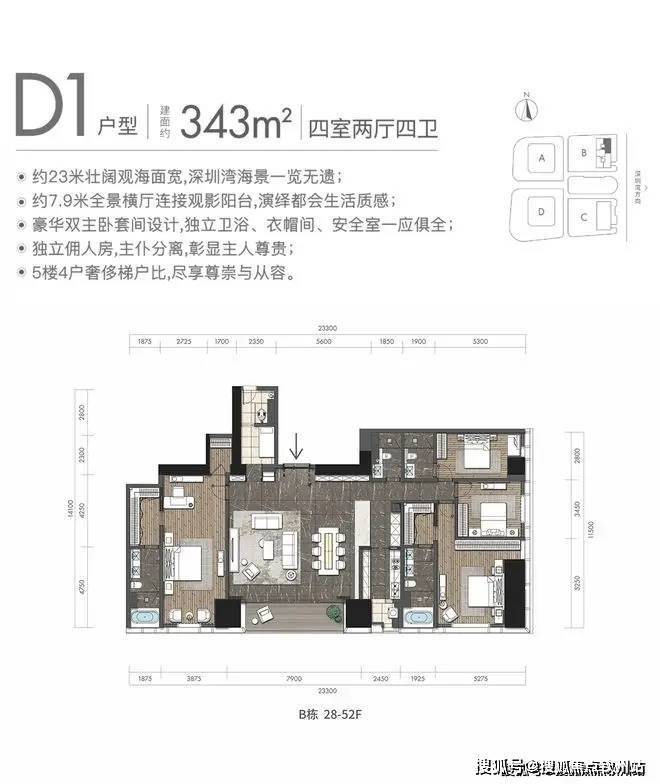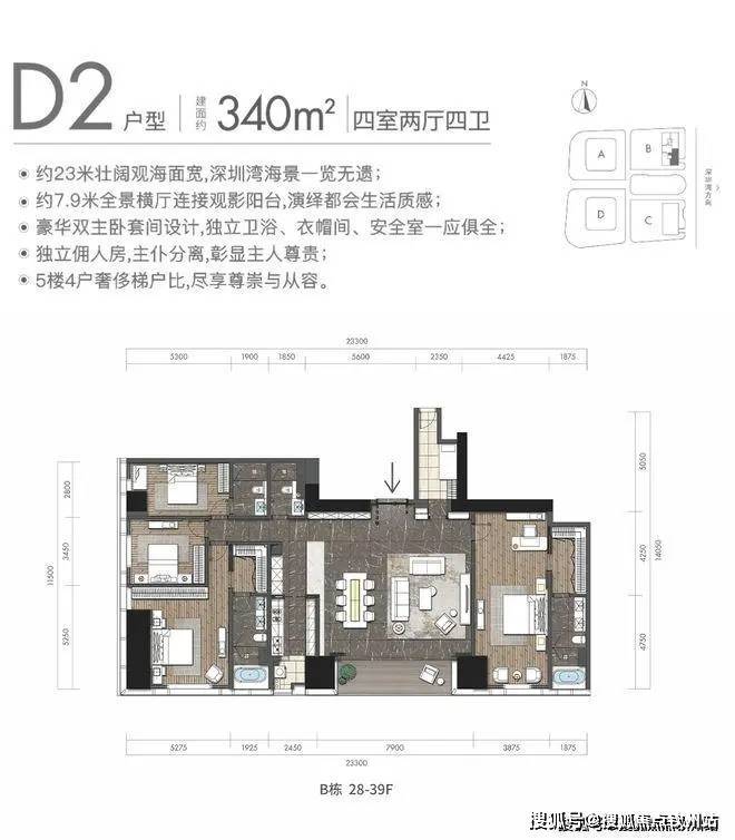 03/04户型:340平4房5卫海景深圳湾景观约23米观海面宽,海景、湾景、城市景观一览无余)