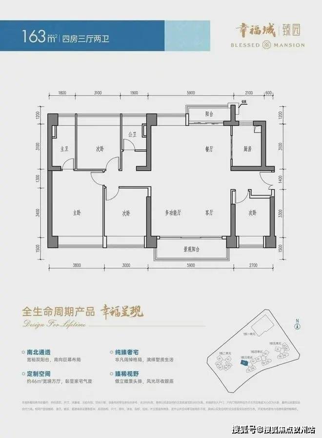 建面约96-163㎡ 3-4房 全生命周期产品 90%户型朝南 南向约300米的罕见楼间距以IMAX级环幕视野最大化地拥抱城市景观