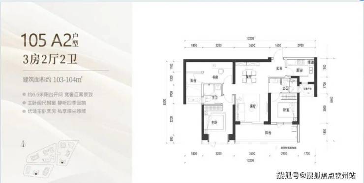 (1)105㎡3房2卫:双龙抱珠格局,朝东/南,阳台开间6.5米,适合刚需家庭。