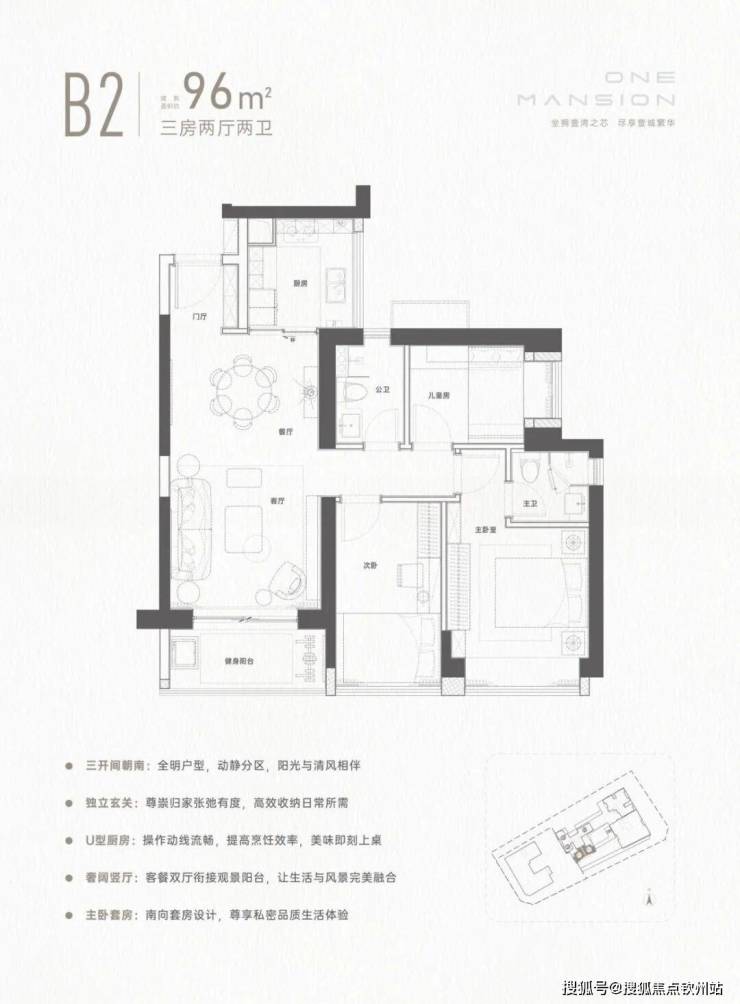 设计的经典竖厅格局,客厅3.6米开间,餐客厅一体化设计,三开间朝南,3个卧室分别做到了3.3米/2.9米/2.7米的宽度,L型厨房,得房率72.47%(不含赠送),东南朝向。