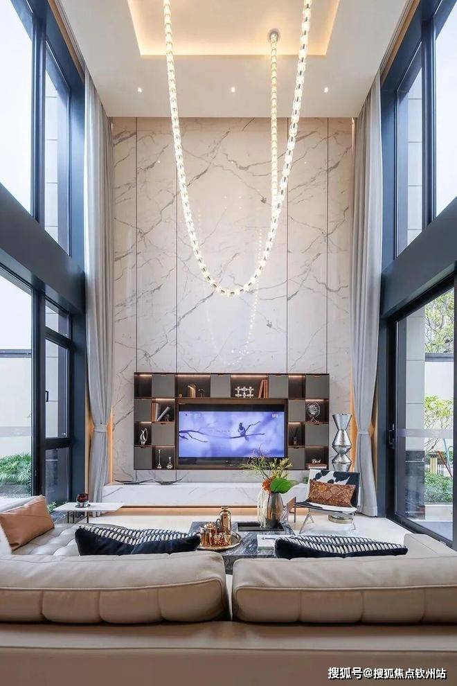一层LDK一体化设计,约6.4米高挑客厅,约4米开间尺度,双面大落地玻璃的设计,更是直接将室内外界限感抹掉,带来IMAX级的采光面,是家庭的欢聚场所,也是大气的社交空间。