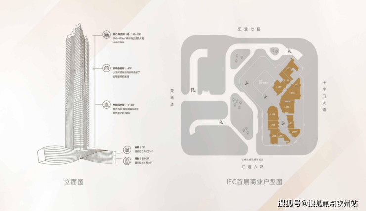 IFC横琴国际金融中心:建筑高度339米,是珠澳第一高楼。华发集团连袂凯达环球Aedas以“乘风驭势,蛟龙出海”为理念,寓意着新生力量磅礴跃起。占地面积约2.3万㎡,总建筑面积约20万㎡,集甲级写字楼、高端住宅、高端商业、会展中心、空中会所等多元高端业态,共69层,其中: