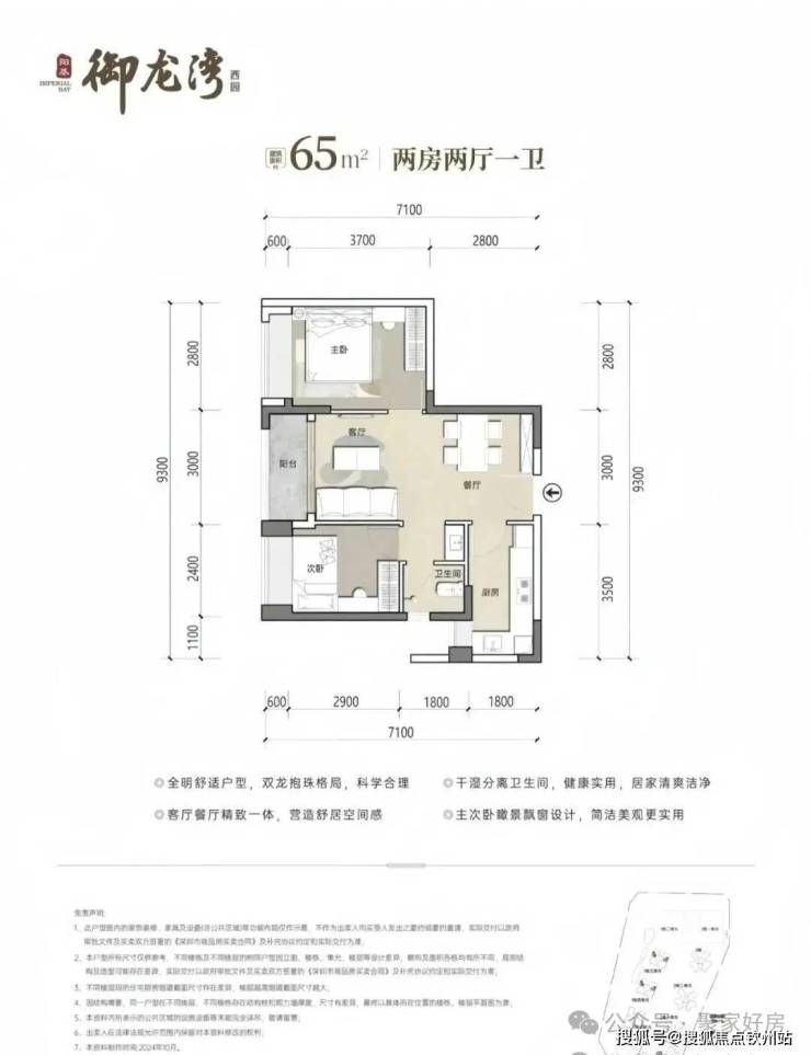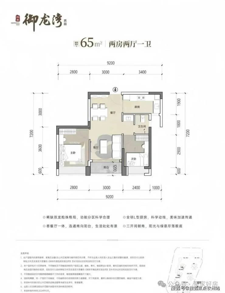 65㎡2房1卫,分布在1栋3/4单元04/05户型,设计的是竖厅稀缺的双龙抱珠格局,客厅开间3米,三开间朝南,L型厨房,卫生间分离设计,得房率约73.26%(不含赠送),西南朝向,加上赠送得房率约80%