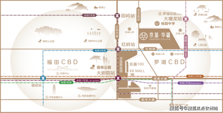 ▸主干道:举步深南大道、滨河大道、红岭中路、宝安南路等3地铁3口岸7轨环绕