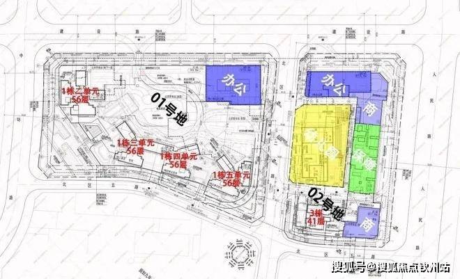 01-01地块,总占地面积约1.93万㎡,总建筑面积约23.8万㎡,计容建筑面积约18.01万㎡,容积率8.81,绿化率40.01%,共由4栋总高56F的住宅组成,1栋1单元办公40F,1栋2/3/4/5单元住宅56F,规划有公交首末站。