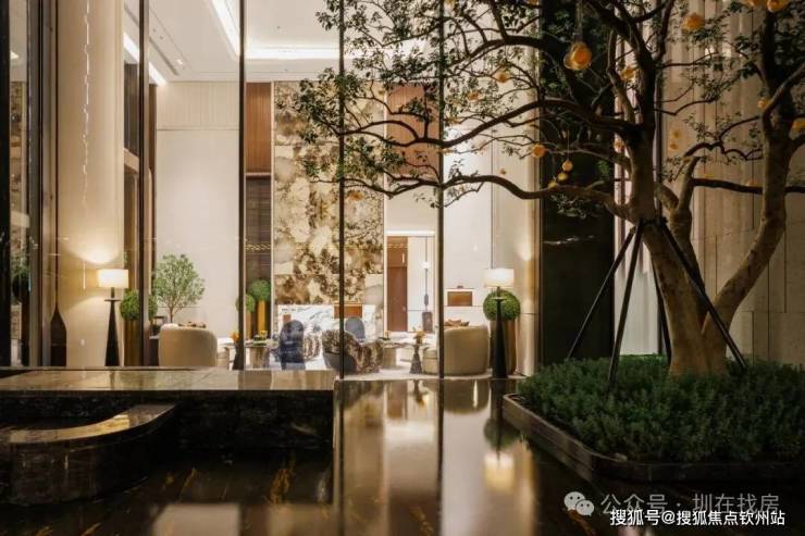这次加推的大平层,配置了双入户大堂,豪奢感比一般品质盘的社区大堂还要夸张。首先是超出住宅规格的尺度,整体挑高约9M,步入大堂的第一步,就会被空间的高阔所震撼。