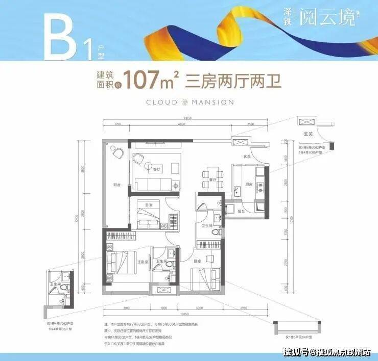 户型面积布局B1107平三房两厅两卫设计的是竖厅格局,进门独立玄关,客厅3.5米开间,LDKB一体化设计,动静分区,3个卧室分别做到了3.1米/3米/2.5米的宽度,客厅连接次卧出6米长的大阳台,二字型厨房还带1个小生活阳台,得房率75-77%(不含赠送),阳台有朝西向、朝东向或朝南向。