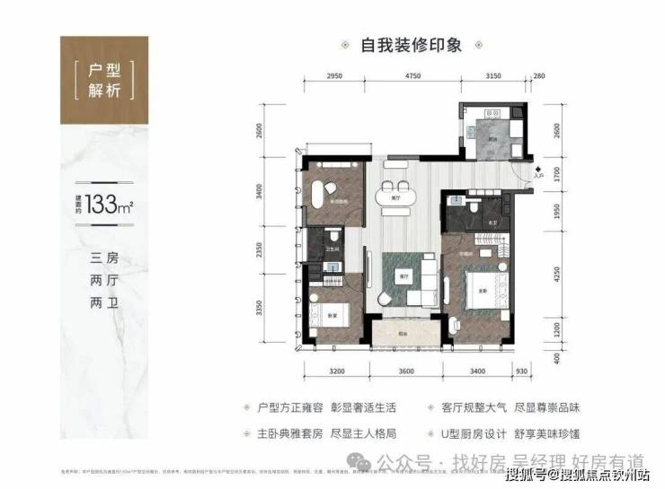 · 133㎡三房:端头户型,双面采光,通透对流,U形厨房,操作面大,空间利用率高。