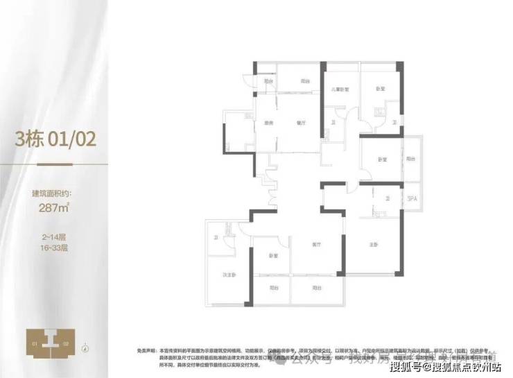 · 287㎡五房:该5+1房五卫户型设计更为阔绰,独立电梯厅入户,餐厅、客厅分开,阔朗大阳台,双主卧套间设计。