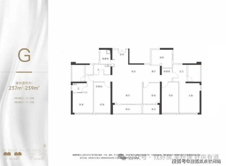 · 237-239㎡四房:该4+1房3厅3卫户型为全南向阔绰海景房,客厅及阳台开间尺度高达8米,海景视野震撼。