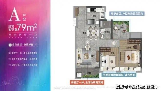 该户型最大的特点,就是在不到80平的空间里,做到普通三房户型的体验。