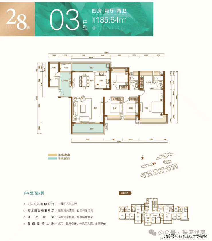 南北通透四居,雙陽臺設計實現270°景觀視野(進深2.4米)
