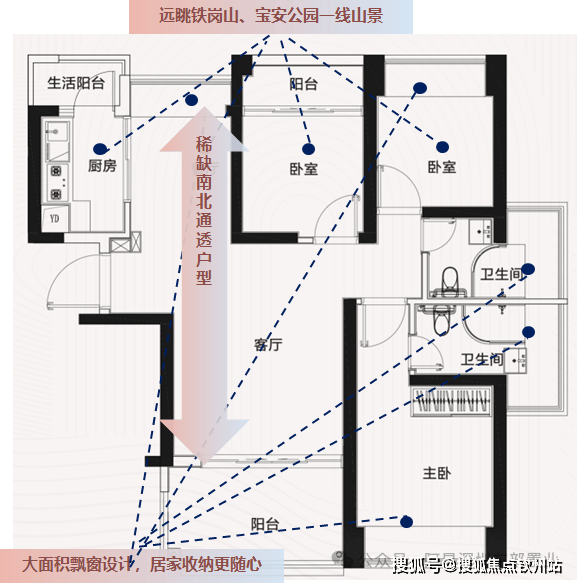 南北通:稀缺端头位,客厅、主卧东南、次卧西北,南北通透,采光、通风无忧