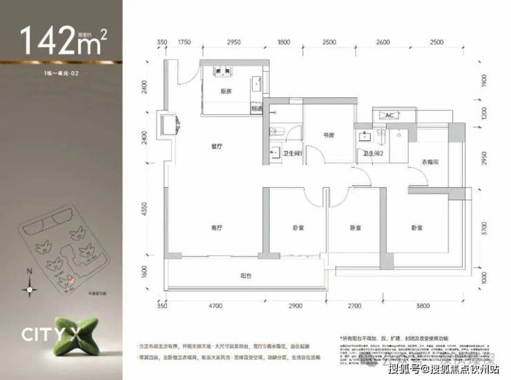 142㎡的4房2厅2卫,1栋1单元02户型,设计的是经典竖厅格局,进门入户玄关,客厅4.7米开间,LDKB一体化,S墙设计预留冰箱卡槽位,四开间朝南,动静分区,分别做到了主卧24.03㎡/次卧9.99㎡/次卧8.99㎡/次卧7.6㎡(包含墙体飘窗),U型厨房,公卫三段式分离,得房率约75.4%(不含赠送),客厅连接次卧出12.16㎡的观景大阳台,东南朝向。套内面积107.06㎡+赠送面积14.75㎡=实得121.81㎡,加上赠送后得房率约85.78%。
