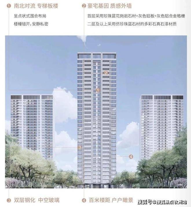 项目采用以深灰与浅灰为建筑主色调的现代简约建筑设计风格,注重居室空间的布局与使用功能的完美结合。外立面采用珍珠蓝仿石漆、水晶灰玻璃、深灰色涂料与深灰色金属百叶的搭配使用,保证建筑的耐久性、稳定性及自洁性,于严苛选材中凝练时光优雅。私密围合布局,一核,一轴,四组团,多节点,户型方正尺度舒适,全景观阳台,户内景观资源视野最大化,地上地下双归家礼仪备享尊崇,打造西区品质标杆。