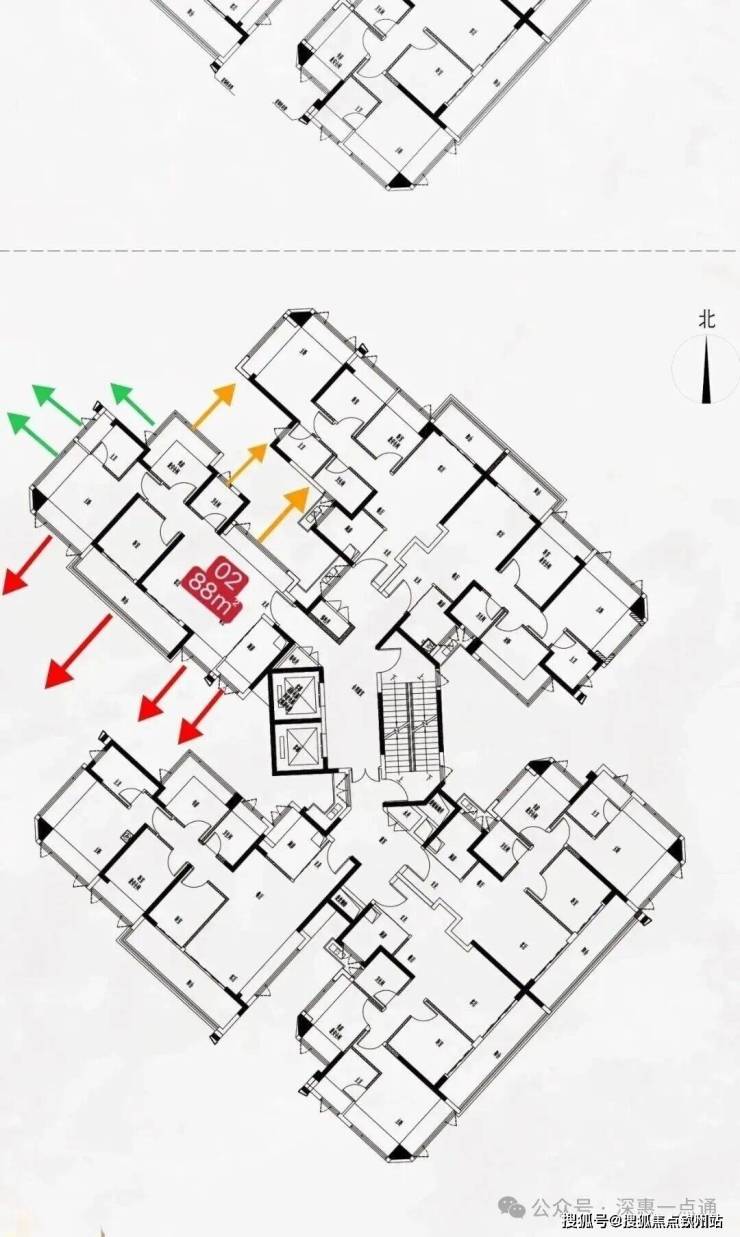 最后再来说一下黄色箭头情况这里是比较需要注意的点这里可以看一下这个楼栋平面图,其中书房次飘窗,客厅卫生间看出去是天井墙体,所以书房做了是双面采光这里还好,卫生间可能影响一点,客厅飘窗也会有跟06户型88平米的书房对视遮挡问题,这里后续可以通过其他问题解决