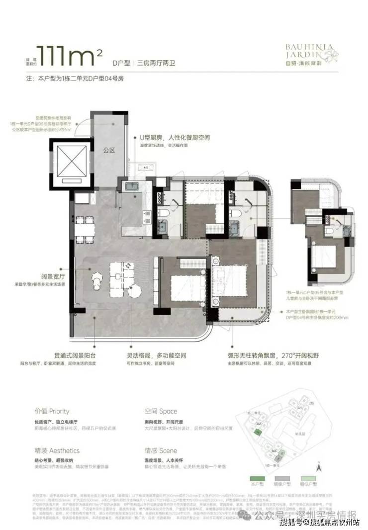 小区有485套纯住宅,车位595个,容积率5.14,共有三栋住宅,每栋做了36-37F高的4梯5户设计,每户都有专梯入户空间。