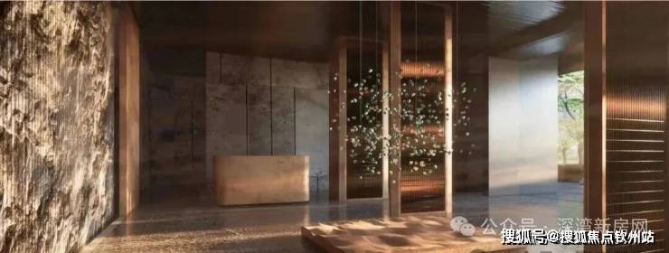 入口50米横向面宽,近6米的高跌水景墙与双层门楼让回家有了一份尊贵与隐奢;随着动线经过穿林,见山,伴水,来到模仿山石色调与铜色金属融合打造的酒店式大堂,一路草木清香、青石铺地、水系流动,自然的隐奢之美扑面而来。