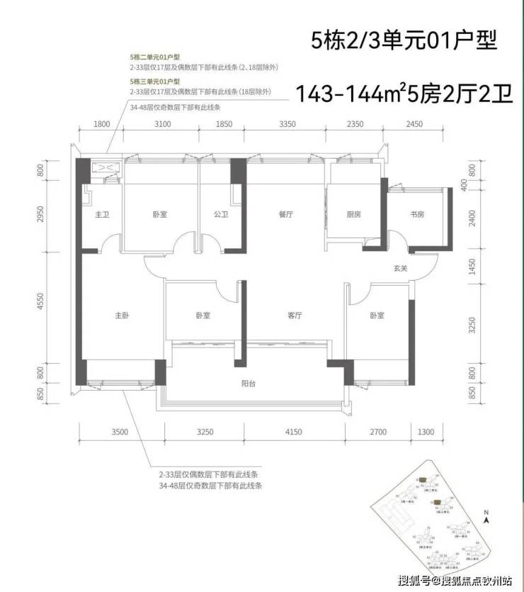 【五栋一单元-平面图】3梯3户,3条腿,分别是01、03号房户型约173㎡的5房2厅2卫、02号房户型约149㎡的5房2厅2卫