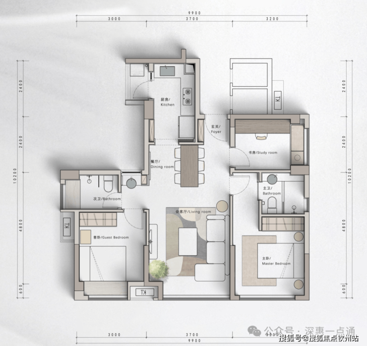 •A1户型:89㎡横厅,使用率接近百分之百,相当于市场105平的户型
