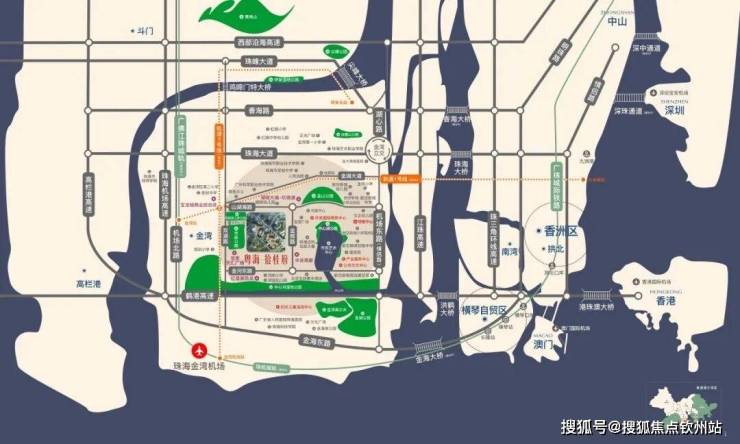 四橋:珠海大橋+洪鶴大橋+金海大橋(建設中)+香海大橋 ,20分鐘直達橫琴,30分鐘到市區 ,30分鐘抵澳門,1小時達香港,貫通粵港澳大灣區。