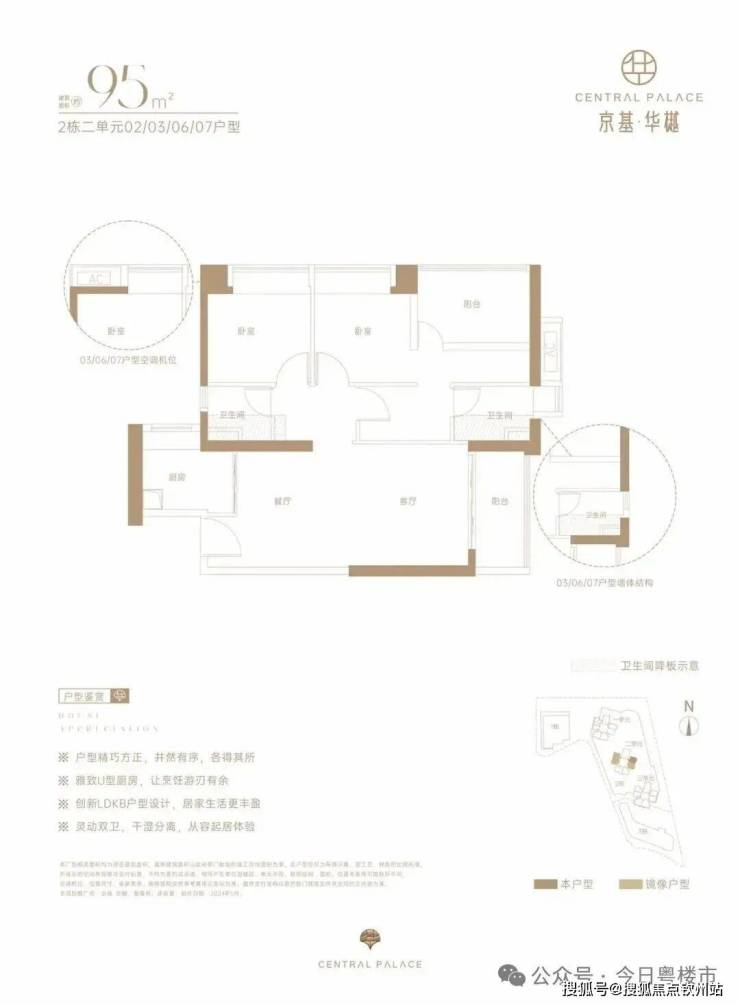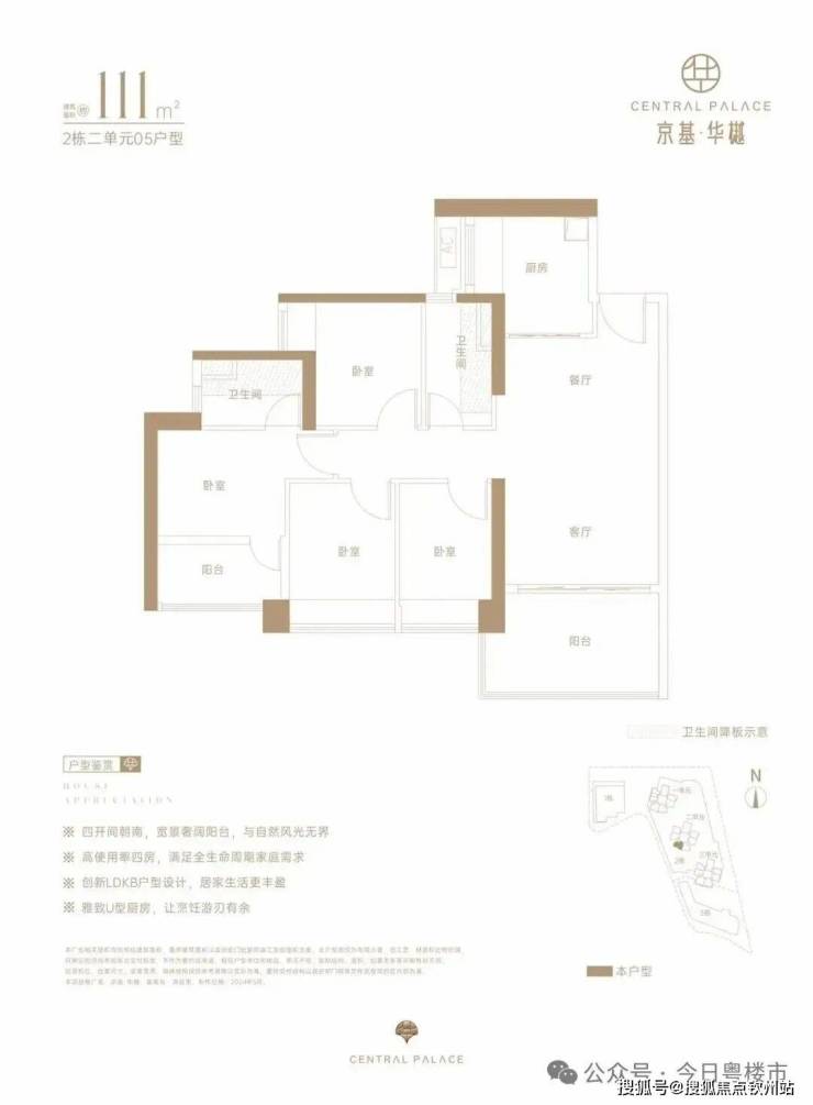 仅2栋2单元05户型才有,设计的是经典竖厅格局,LDKB一体化,动静分区,四开间朝南,U型厨房,卫生间干湿分离,得房率约73%(不含赠送),阳台西南朝向。