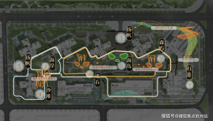 再来说园林,规划体量很大,融入山海风情,还有下沉式庭院丰富内部景观的层次感,将游园动线从平面升维到立体。