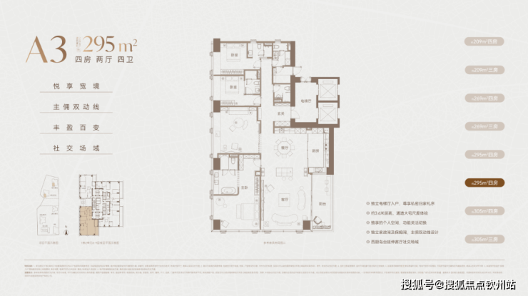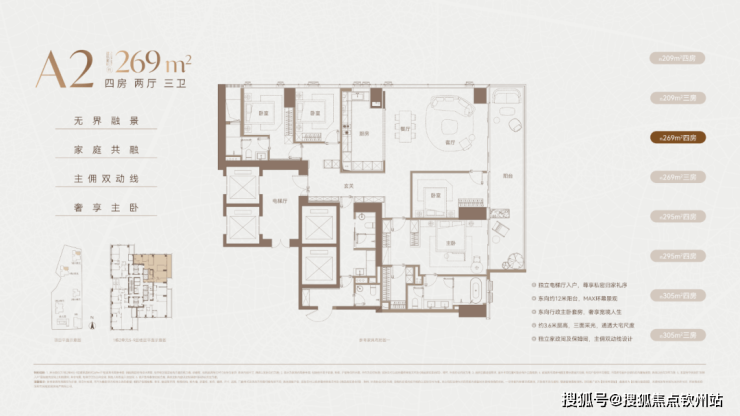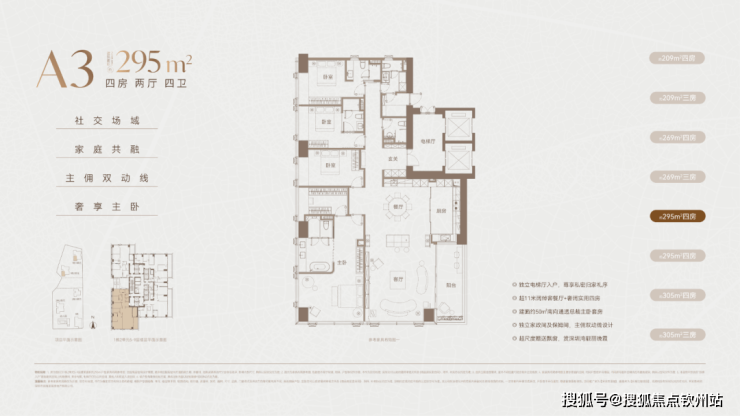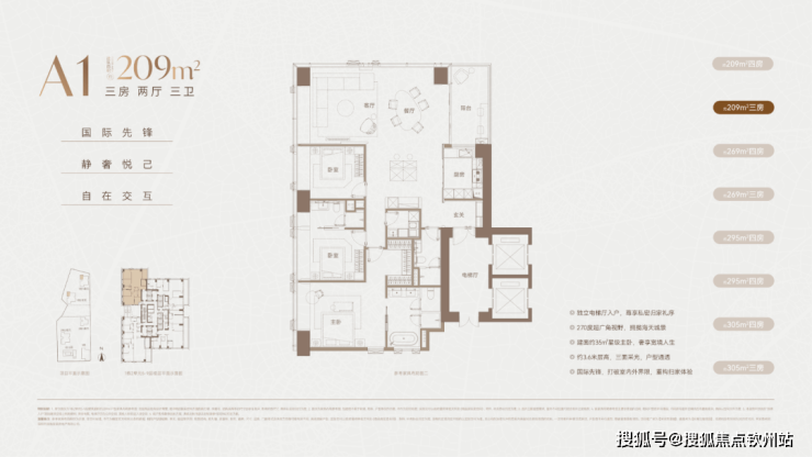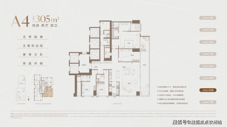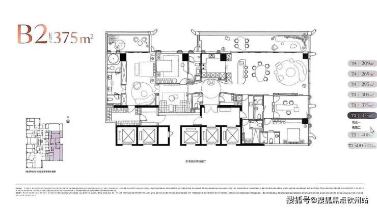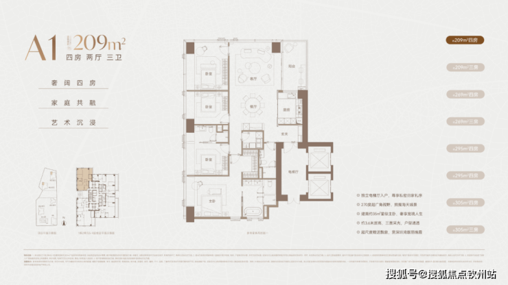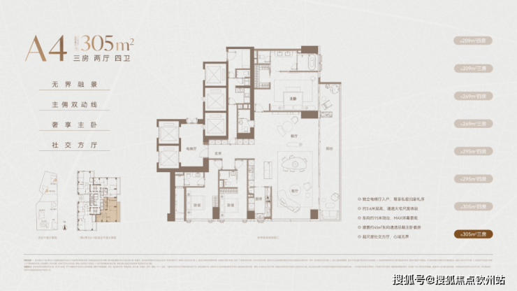 主力户型:主打200㎡以上大平层,209~269~294~305~375~403~500~700~1050㎡ ,满足高净值客群对大空间的需求。