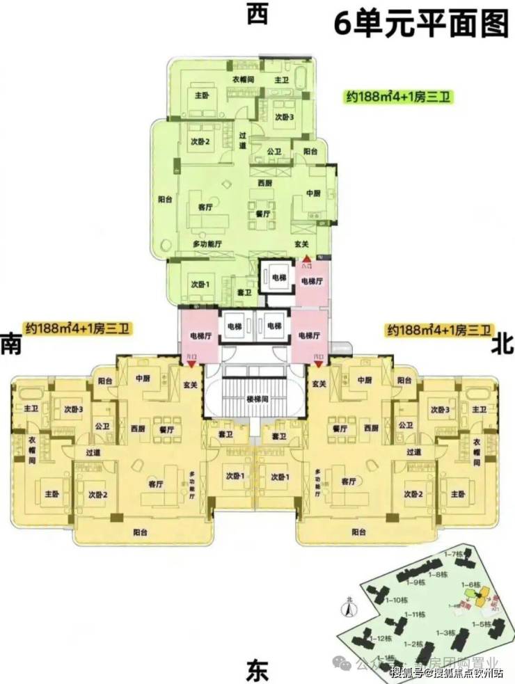 6单元:23层,3梯3户, 建面约188㎡
