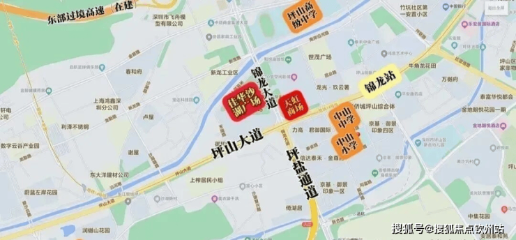 佳华沙湖广场项目位于坪山区坪山大道与锦龙大道交汇处西北角(14号线地铁锦龙站旁),项目是包含商业、办公/公寓、住宅、幼儿园于一体的大型综合体,总建面超62万㎡。隔壁是深业国际东城、力高君御国际等住宅区。