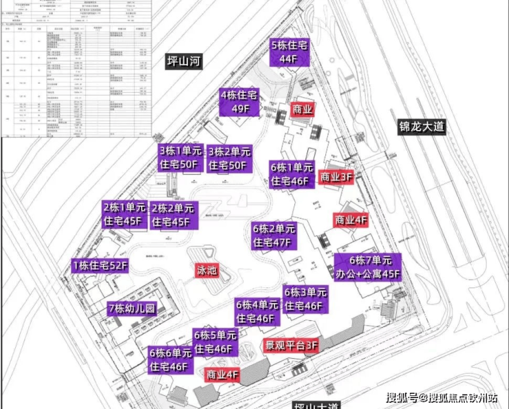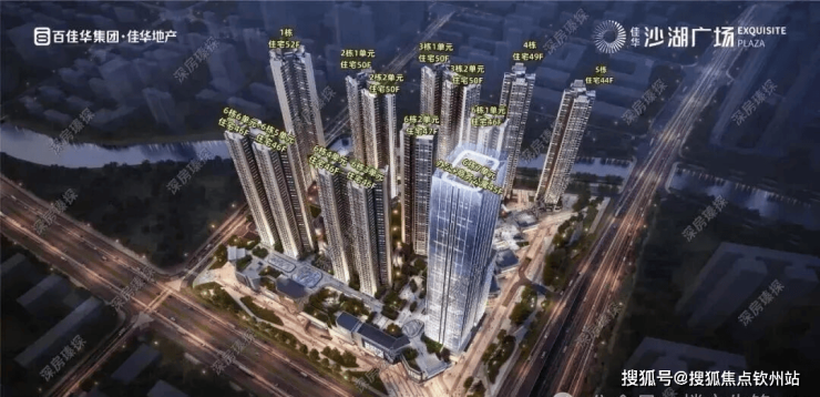 由佳华集团操盘,总占地面积约8.17万㎡,总建筑面积约62.2万㎡,计容建筑面积约42.6万㎡,容积率5.21,绿化率30%,共由6栋14个单元总高44-52F的住宅组成,其中1栋回迁房52F,2栋1/2单元回迁房50F,3栋1/2单元商品房50F,4栋商品房49F,5栋商品房44F,6栋1/3单元商品房46F,6栋2单元商品房47F,6栋4/5/6单元回迁房46F,6栋7单元办公+商务公寓45F,7栋规划1所幼儿园。