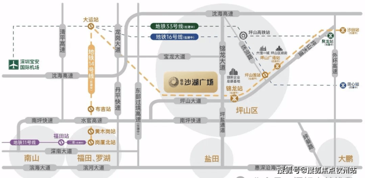 地铁:紧邻地铁14号快线坪山门户站——锦龙站700米(已通车),12站福田岗厦北。地铁16号线(预计2022年内通车)、地铁33号线(在建)