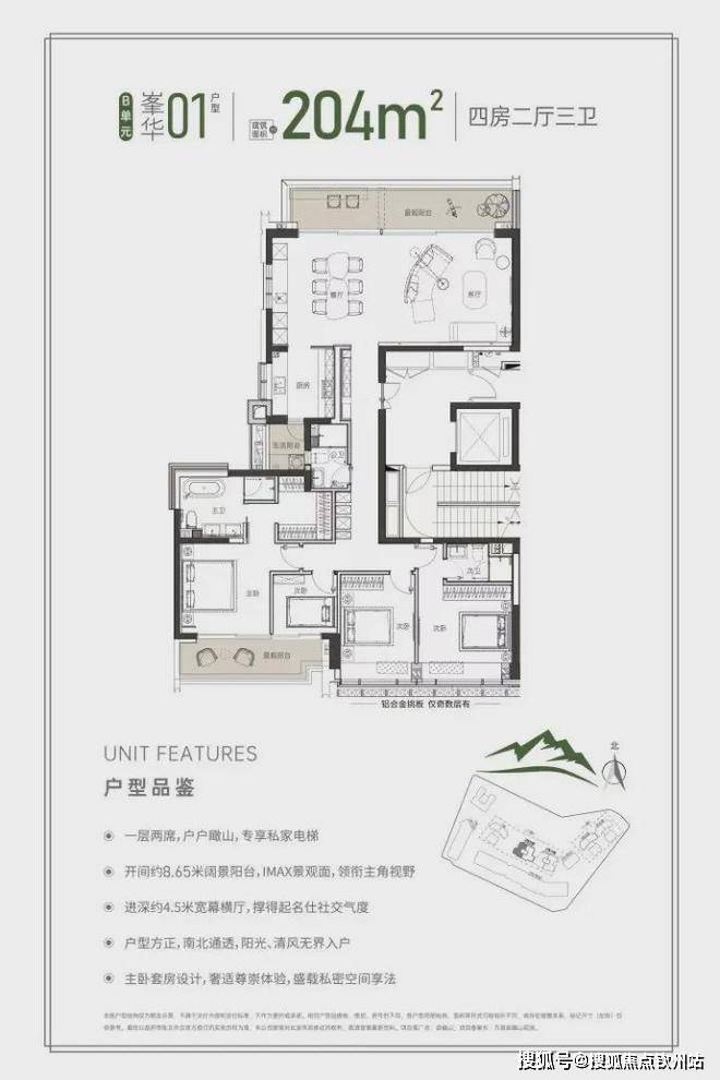 同样的专梯入户,豪宅感扑面而来,该户型为顶级大户型,四阳台设计,最大有10.55米的景观阳台和180度视野的餐客厅空间奢阔气场尽显,罕见的南北瞰景四阳台设计,让家的每个角落都能欣赏美丽的山景和城市景观。所有的开窗面都尽可能放大,客餐厅、书房、卧室、几乎都能享受超宽超大屏