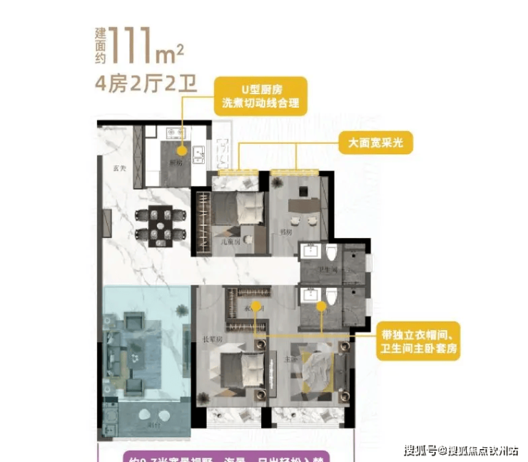 规模:总占地约 33.4 万㎡,总建面约 73.7 万㎡,容积率 1.5,绿化率 35%,规划住宅约 2594 户,车位比 1:1.2。项目整体分三期开发,高层为 2 梯 4 户或 2 梯 5 户设计。