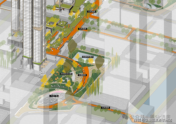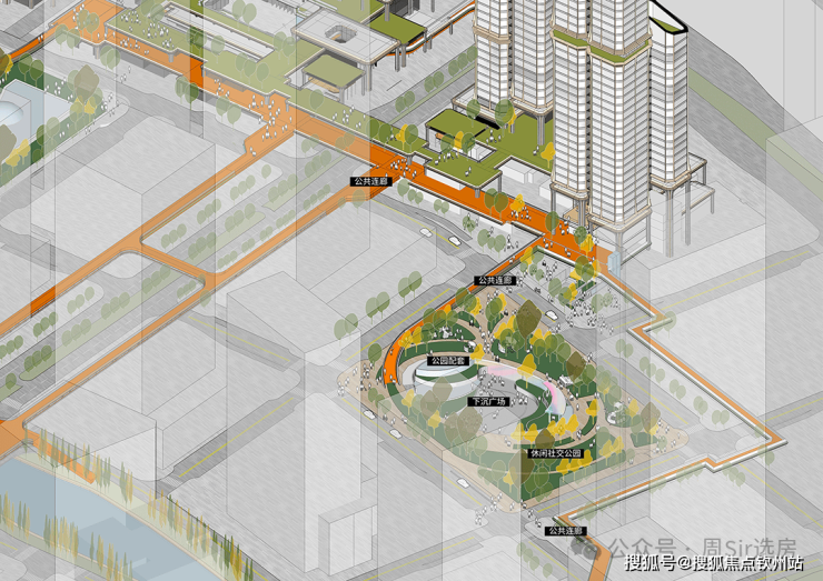 以既有空中连廊系统为基底,向北延伸公共步道,贯通南北口袋公园。整合首层、二层及地下慢行系统,形成四维立体通廊,将住区纳入更广阔的城市公共网络。