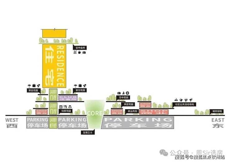 从这个侧面结构图来看,构造更接近于目前外国新晋的豪宅综合体,带有空中花园+架空花园+会所等多功能融合,底部还配备了一些街区商业,可以做一些轻奢或者高奢精品店。