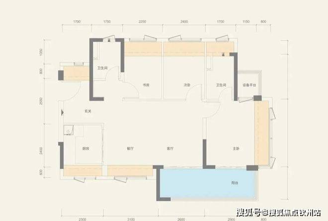 89㎡的3房2厅2卫,设计的是横厅南北通透格局,进门入户玄关,客餐厅5.7米开间,LDKB一体化,四开间朝南,3个卧室分别做到了主卧11.42㎡/次卧7.31㎡/次卧6.93㎡(实测面积,去掉墙体),主卧还带1个设备平台,主卧连接客厅出5.5米长的超大阳台,U型厨房,卫生间三段式分离,赠送面积高达20.09㎡,实际得房率约101%(包含赠送),西南/东南朝向。