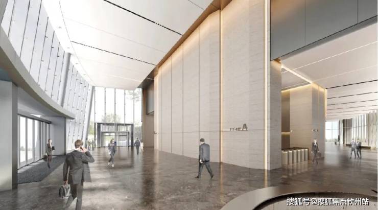 【企业门面】:首层大堂入户挑高约13.45米,建筑面积约1600㎡,彰显企业恢弘气度与排场;高中低区设立空中大堂,大宗客户可设计专属总部大堂区域。