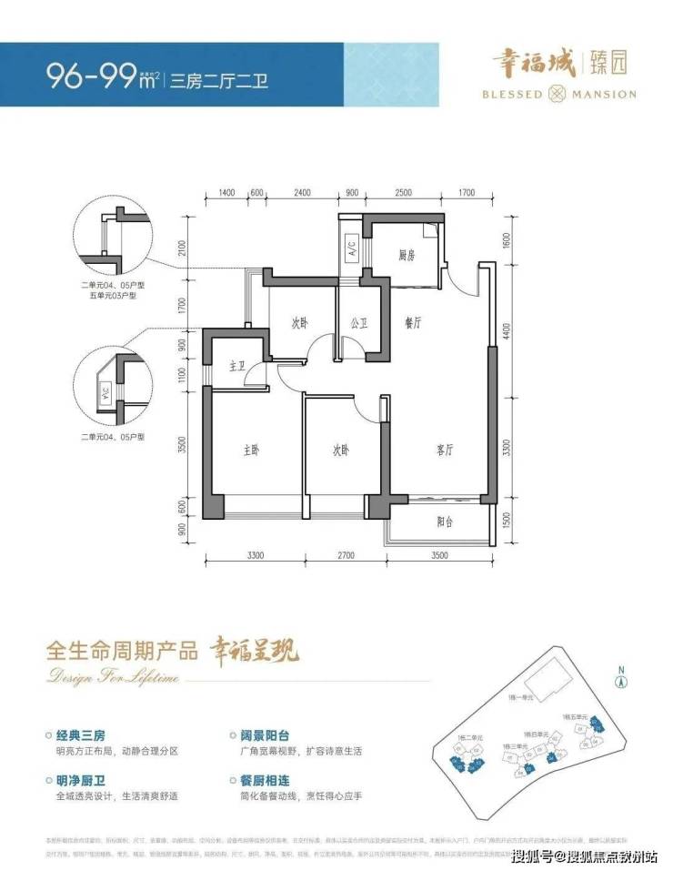 面积:96-99㎡三房两厅一卫