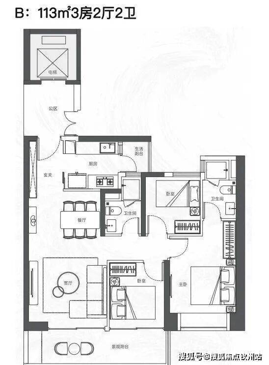113㎡三房:总价737万起,套内使用率72%,西南朝向+6.5米观景阳台,次卧面宽2.7米需改造;