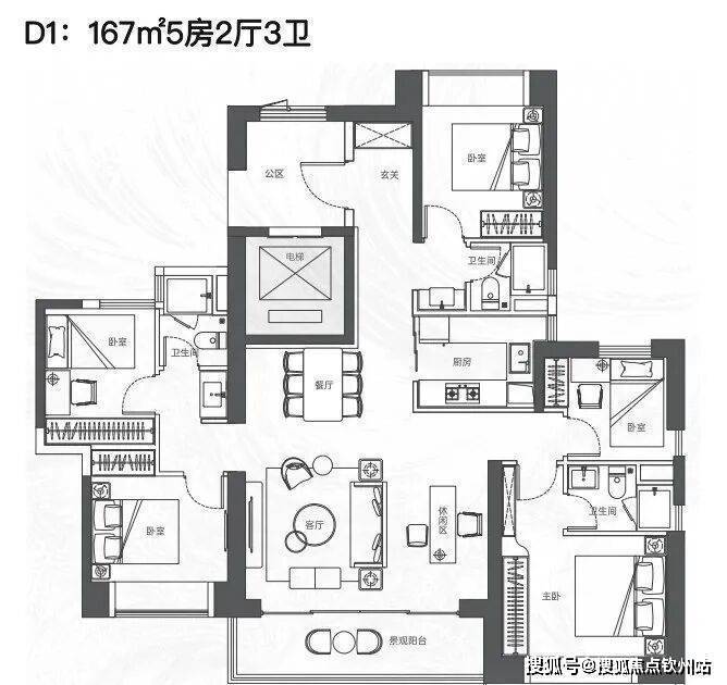 167㎡五房:总价1347万起,南北通透+双主卧套间,但厨房无生活阳台,精装品牌未公示。