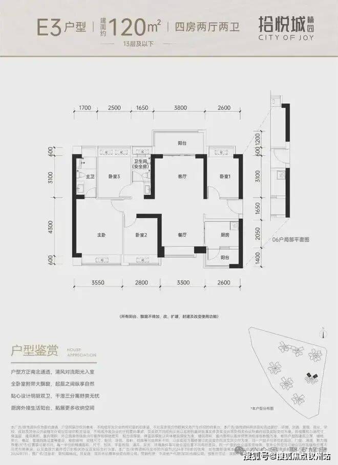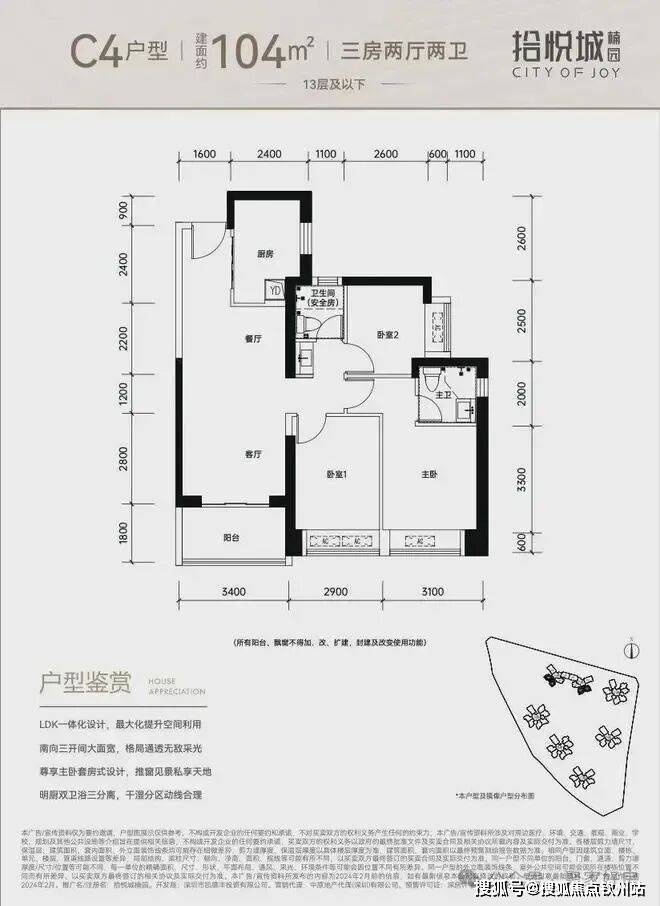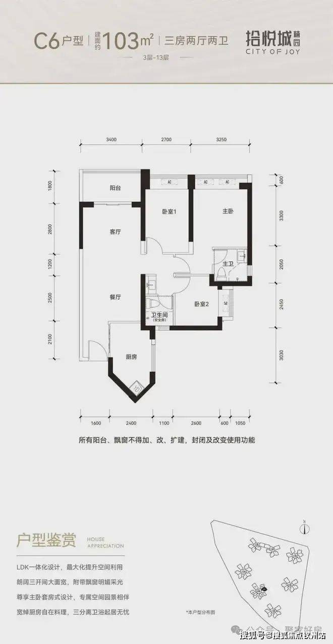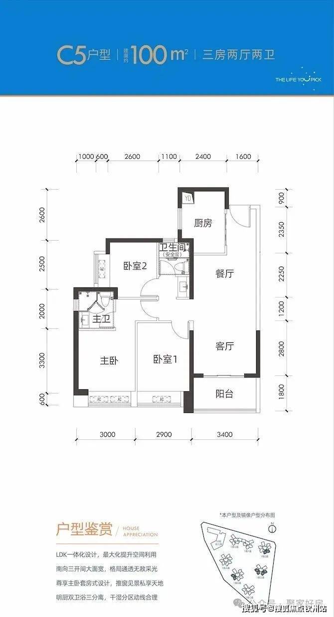 100平三房:设计的是竖厅格局,进门入户玄关,客厅3.4米开间,LDKB一体化设计,3个卧室分别做到了3米/2.9米/2.5米的宽度,U型厨房,公卫三段式分离,得房率:77.14%(不含赠送),阳台1.8米宽度,西南或东南朝向。