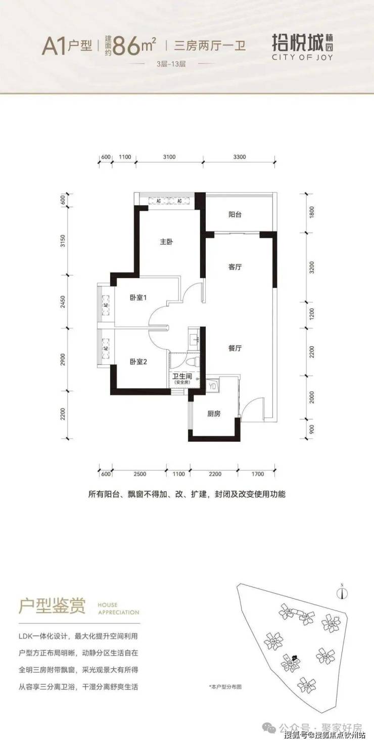 86平三房:设计的是竖厅格局,进门入户玄关,客厅3.3米开间,LDKB一体化设计,3个卧室分别做到了3.1米/2.9米/2.45米的宽度,U型厨房,卫生间三段式分离,得房率:76.92%(不含赠送),阳台1.8米宽度,东北朝向。